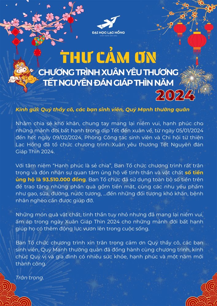 Phòng CTSV và Chi hội từ thiện Lạc Hồng kính gửi Quý thầy cô, các bạn sinh viên, Quý Mạnh thường quân Thư cảm ơn của Ban Tổ chức chương trình Xuân yêu thương Tết Nguyên đán Giáp Thìn 2024.