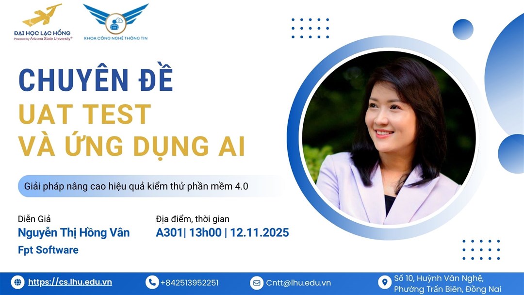 On the afternoon of November 12, 2025, the Faculty of Information Technology at Lac Hong University organized a seminar titled "UAT & AI Application" for students across all cohorts, featuring guest speaker Ms. Nguyen Thi Hong Van – an expert from FPT Software HCM.
