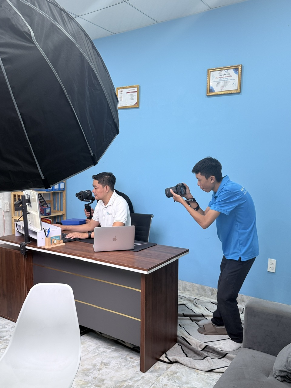 Phu is conducting an interview video with Ms. Nhu Ngoc, a lecturer in the Multimedia Communication program.